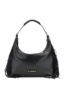 Sac bandoulière en similicuir avec franges latérales et logo métallique sur le devant. Un accessoire audacieux et tendance, parfait pour un look affirmé.