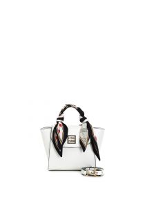 Sac bowling rigide en matériau à effet ondulé poignée en chaîne avec foulard en fil fantaisie entre les maillons de la chaîne plaquette carrée personnalisée. bandoulière supplémentaire amovible.