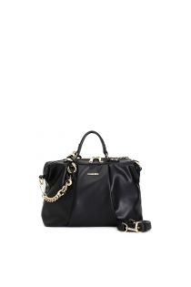 Sac bowling avec pli central et logo en métal. poignées plates. double bandoulière avec chaîne bicolore ou dans la même matière que le sac. fermeture à glissière.