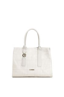 Sac de forme carrée avec poignées assorties et accessoire cafènoir à la base de la poignée.