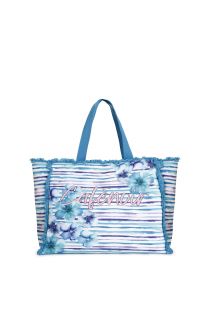 Sac de plage en tissu imprimé avec franges décoratives poignées en ruban contrasté et doublure intérieure unie. pratique et léger parfait pour vos journées d'été.
