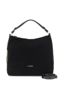 Sac souple effet daim avec breloque zippée et inscription métallique. Bandoulière amovible et style raffiné, parfait pour des tenues du quotidien avec une touche bohème chic.