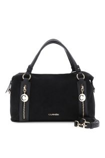 Sacoche souple effet daim avec breloque zippée et inscription métallique. Bandoulière amovible et design épuré pour un style raffiné et contemporain.