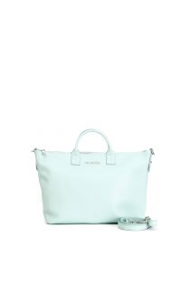 Sac fourre-tout en cuir de forme trapézoïdale avec poignées et bandoulière en option.