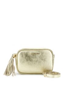sac photo en cuir laminé avec bandoulière, mousquetons et pompon gold