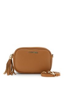 sac photo en cuir martelé avec bandoulière, mousquetons et pompon tan