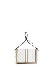 Sac rigide avec long rabat à porter avec une bandoulière réglable imprimé logo sur toute la surface et rayures verticales au centre du rabat.