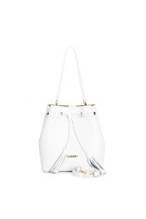 Sac seau avec cordon de serrage et dentelle à pompons. poche ouverte devant. double bandoulière courte et longue avec mousquetons.