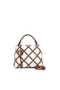 Sac seau en tissu avec un tissage tressé effet de maille et des applications de cabochons dorés. breloque avec logo effet cuir. fermeture à glissière. sac bandoulière.
