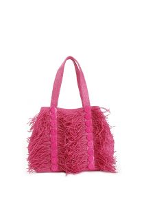 sac shopping en raphia avec franges et boutons décoratifs hot pink