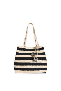Sac cabas rayé en raphia et toile avec breloque pompon et plaque logo en métal. fermeture avec aimant et mousqueton. parfait pour un look d'été chic