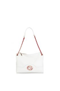 Sacoche avec logo ovale émaillé multicolore et chaîne filetée. bandoulière avec chaîne filetée. fermeture à glissière.