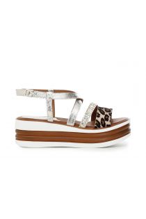 Sandales à brides croisées en sequins et poulain sur semelle compensée bicolore