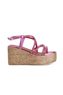 sandales à brides croisées en strass sur semelle compensée en raphia hot pink