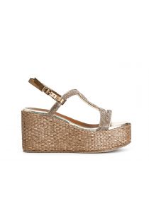 Sandales à double bande motif en strass. semelle compensée en raphia.