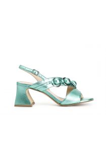 Sandales à empeigne asymétrique en cuir laminé et accessoire décoratif à trois sphères. une chaussure qui peut être portée toute la journée grâce à son talon large de 55 mm de haut et à sa base confortable.