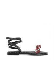 Sandales avec des lanières à nouer autour de la jambe ornées d’une bande en strass et raphia tressé et semelle en cuir avec trépointe avec cabochons. Semelle intérieure et doublure en cuir.