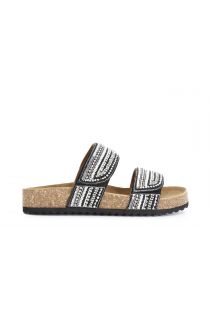 Sandales basses modèle mules avec base en liège et bandes réglables décorées de strass dégradés. un croisement entre le style bohème et le style ethnique pour un été plein de style