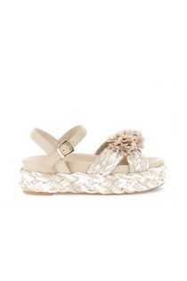sandales compensées croisées avec bride en raphia et fleurs taupe
