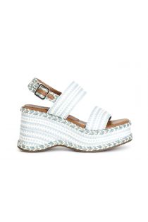 Sandales avec deux bandes ethniques. coin enveloppé toujours en tissu ethnique. la semelle intérieure confortable en cuir véritable rend la chaussure confortable même après plusieurs heures d'utilisation. le talon mesure 8 cm de haut tandis que le plateau mesure 4 cm.