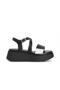 Sandales croisées bicolores en cuir et paillettes sur semelle compensée.