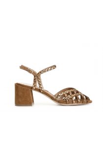 Sandales effet cage triangulaire en microfibre et strass. bride de cheville et talon haut de 60 mm