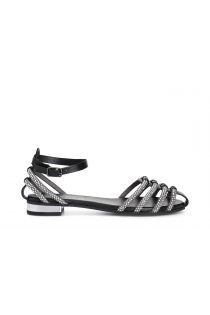 Sandales cage en cuir avec décoration en microstrass et patch à l'arrière. la doublure et la semelle intérieure sont en cuir. le talon mesure 2 cm.