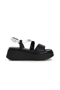Sandales en cuir bicolore avec lanière asymétrique sur semelle compensée.