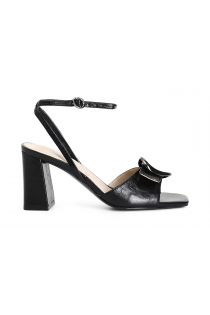 Sandales en cuir verni avec bride à la cheville et boucle réglable sur le pied. dessus doublure et semelle intérieure sont en cuir. talon large de 8.5 cm de haut. chaussure élégante stylée et formelle.
