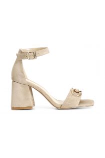 Sandales en daim avec accessoire doré. contrefort avec bride à boucle réglable à la cheville. talon haut de 70 mm.