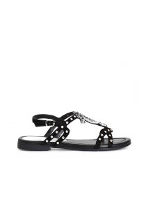 Sandales en daim avec clous et accessoire en forme d'hippocampe avec clous en strass et perles. la doublure et la semelle intérieure sont en cuir. le talon mesure 2 cm de haut. confortable à porter et facile à assortir.