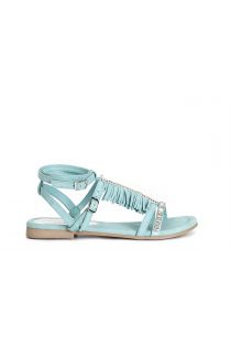 Sandales en daim avec motif "t" frangé et chaîne en strass. la doublure et la semelle intérieure sont en cuir. le talon mesure 2 cm de haut. confortable à porter et facile à assortir.