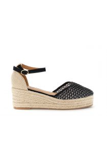 Sandales compensées de 6.3 cm avec empeigne en maille tissée et bordure en tissu bout fermé et bride cheville. plateforme de 2.9 cm et semelle intérieure en cuir. semelle extérieure en corde à plusieurs épaisseurs pour un look estival et confortable idéales au quotidien.