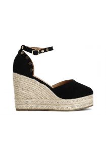 Sandales en tissu à semelle compensée en corde et plateforme. bride de cheville en tissu. chaussure fermée à l'avant et à l'arrière. cabochons dorés sur le contrefort et la bride.
