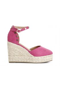 Sandales en tissu à semelle compensée en corde et plateforme. bride de cheville en tissu. chaussure fermée à l'avant et à l'arrière. cabochons dorés sur le contrefort et la bride.