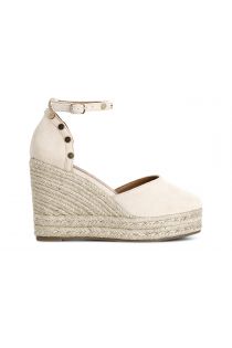 Sandales en tissu à semelle compensée en corde et plateforme. bride de cheville en tissu. chaussure fermée à l'avant et à l'arrière. cabochons dorés sur le contrefort et la bride.