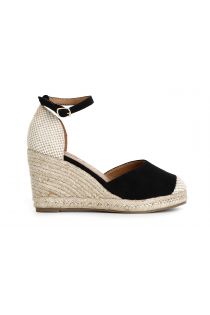Sandales en tissu sur semelle compensée en corde. bride de cheville en tissu. chaussure fermée à l'avant et à l'arrière.