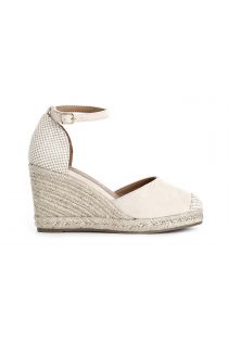 Sandales en tissu sur semelle compensée en corde. bride de cheville en tissu. chaussure fermée à l'avant et à l'arrière.