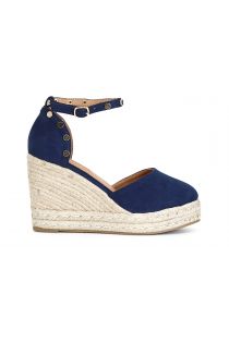 Sandales sur semelle compensée en corde avec bride à la cheville en tissu fermée devant et derrière avec cabochons dorés.