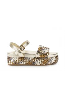 Sandales compensées en similicuir tressé multicolore or bronze et platine ou blanc or et argent. semelle haute et bride ajustable pour un confort et un style optimaux. hauteur de semelle : 3.5 cm. idéales pour des looks d'été dynamiques et ultra-polyvalents.