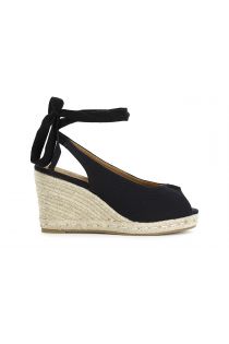 Sandales à semelle compensée et plateforme en corde avec lanières à nouer autour de la jambe en toile.