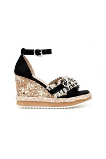 Sandales fermées derrière en daim et raphia avec franges multicolore avec accessoire strass et perles en bois sur semelle compensée en plusieurs matières.