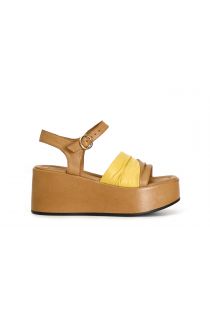 Sandales modèle gilda bicolores sur semelle compensée en cuir.