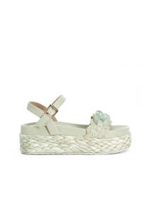 Sandales color block en raphia tressé avec accessoire chaîne transparente satinée. semelle renforcée et la semelle compensée est gainée en raphia.