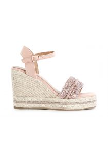 Sandales modèle gilda en raphia avec insert en micro-strass. semelle compensée en corde ornée d’une bande en micro-strass.