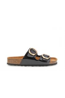 Sandales style mocassin à double bride en matière brillante et boucles dorées maxi réglables. semelle intérieure anatomique en liège et latex semelle extérieure légère de 3 cm avec adhérence. confort au quotidien et touche d'audace parfaites pour un look chic et décontracté.