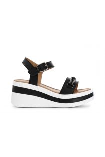 Sandales en nappa avec accessoire en strass. semelle compensée large et confortable avec semelle intérieure rembourrée gainé en nappa. bride à boucle réglable à la cheville.