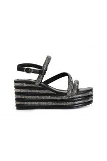 Sandales à bandes avec strass. semelle compensée caractérisée par l'alternance de bandes de strass. la confortable semelle intérieure en cuir véritable rembourrée rend la chaussure confortable même après plusieurs heures d'utilisation. le talon haut mesure 70 mm de haut la plateforme 35 mm.