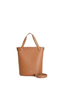 Sac seau en matière grenat raffinée détails de clous logotés et bandoulière réglable et amovible pour un style pratique et élégant.