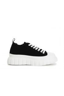Sneakers à lacets en tissu avec franges semelle surélevée décorée d'un motif rayé. modèle qui se distingue par un embout en caoutchouc qui décore la chaussure.